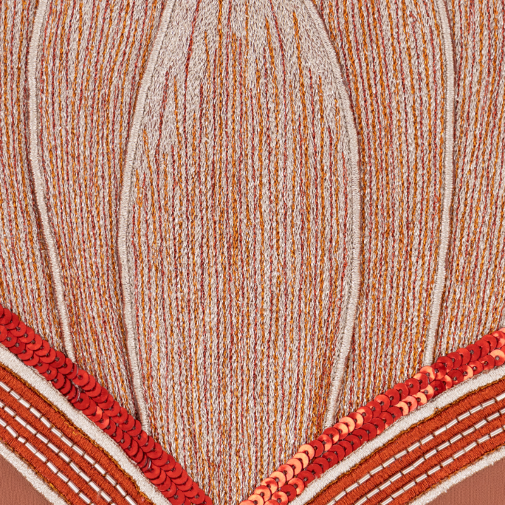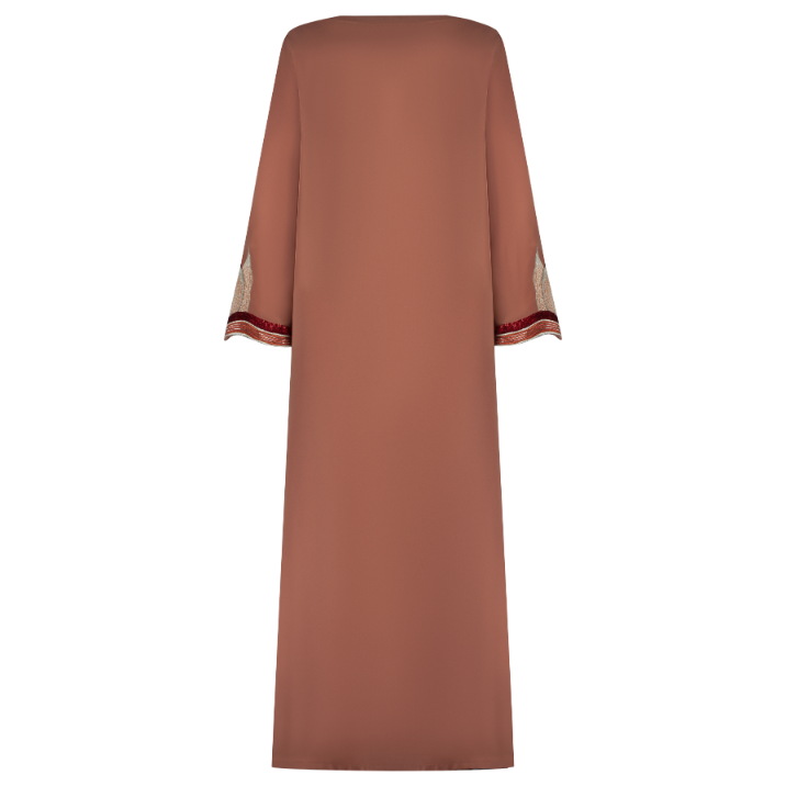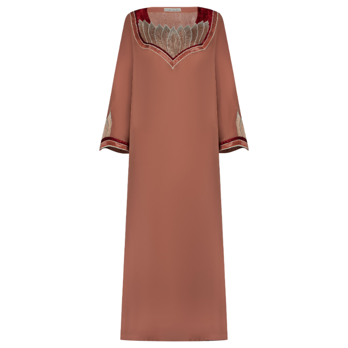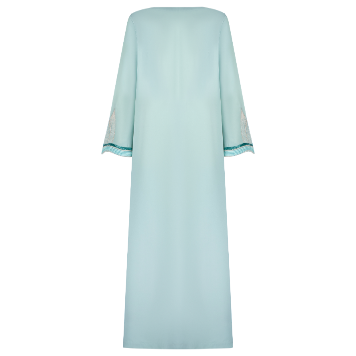 The “Athba” Mukhawara boasts a straight-cut silhouette with an irregular neckline adorned with a captivating 3D leaf pattern embroidery. Lines of shimmering glass beads accentuate the neckline and sleeves, adding a touch of refined luxury. The sleeves further showcase intricate 3D leaf motifs embellished with delicate beadwork. Athba is the perfect choice for a graceful and effortlessly luxurious look.