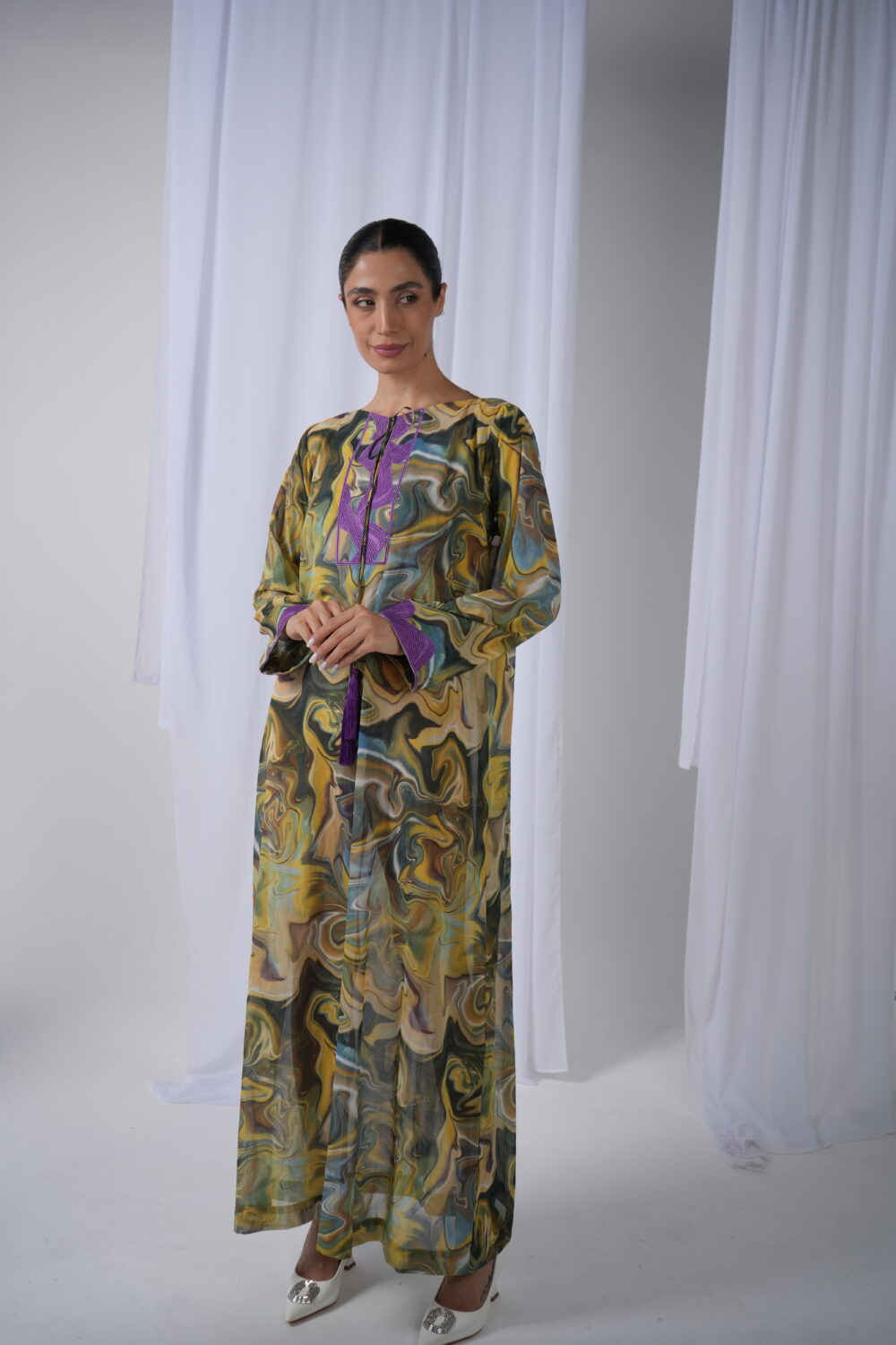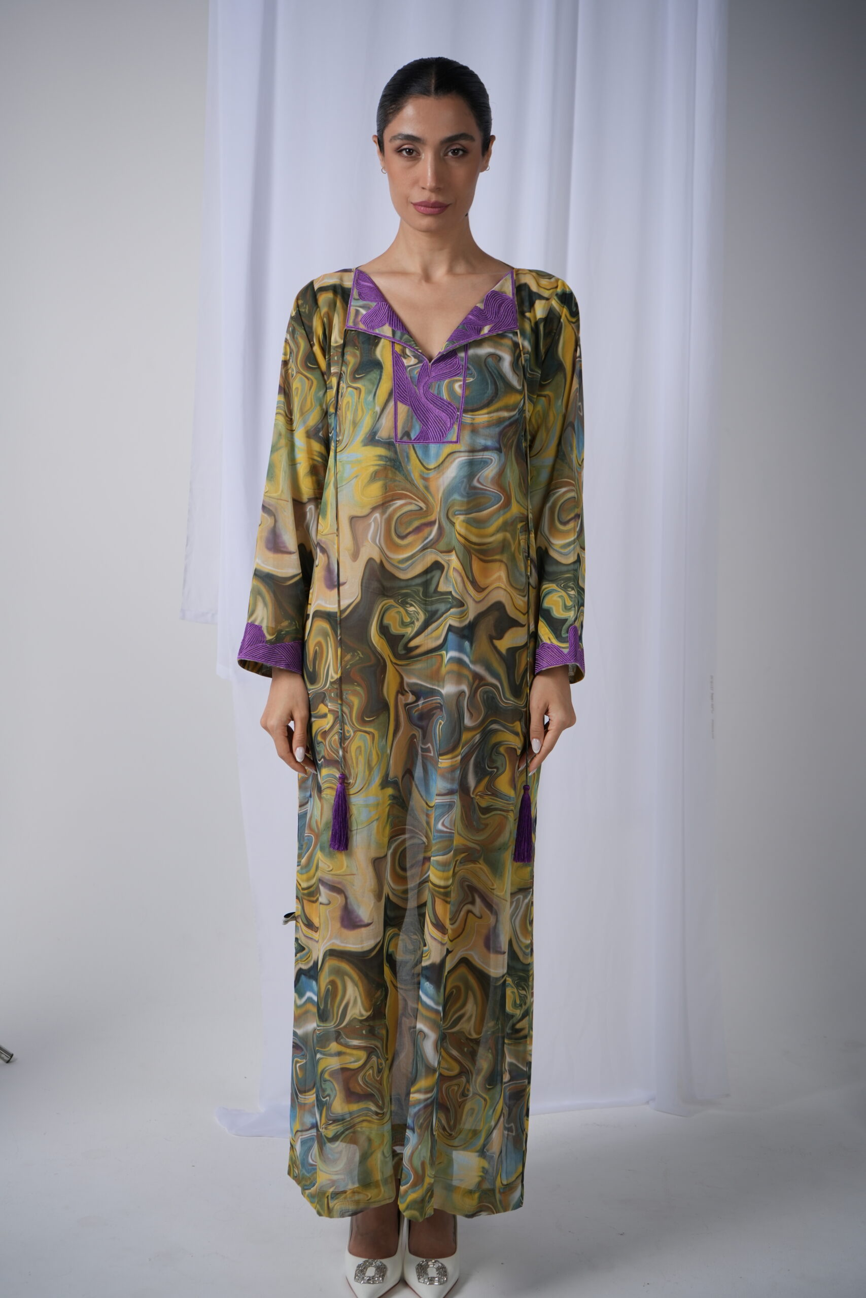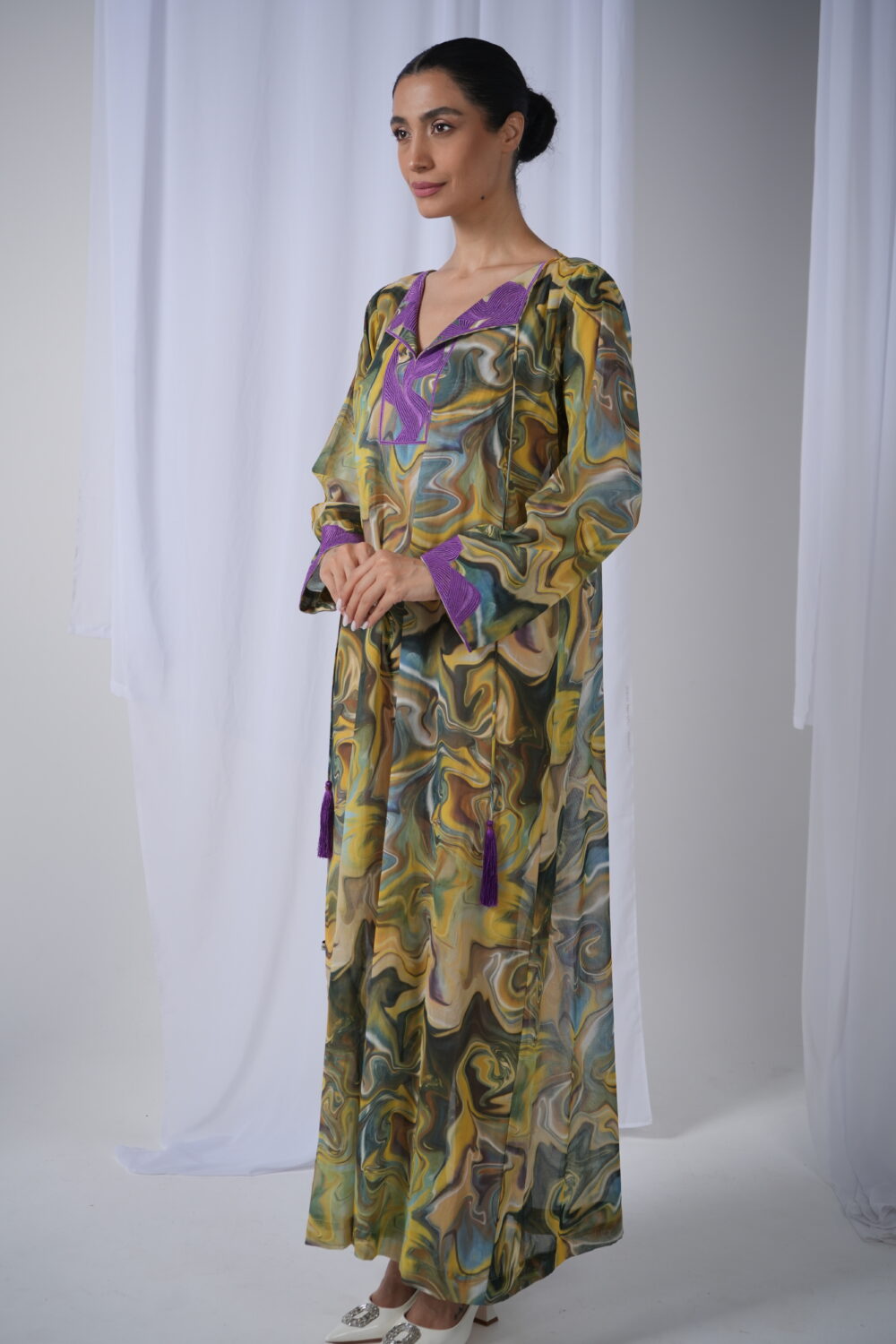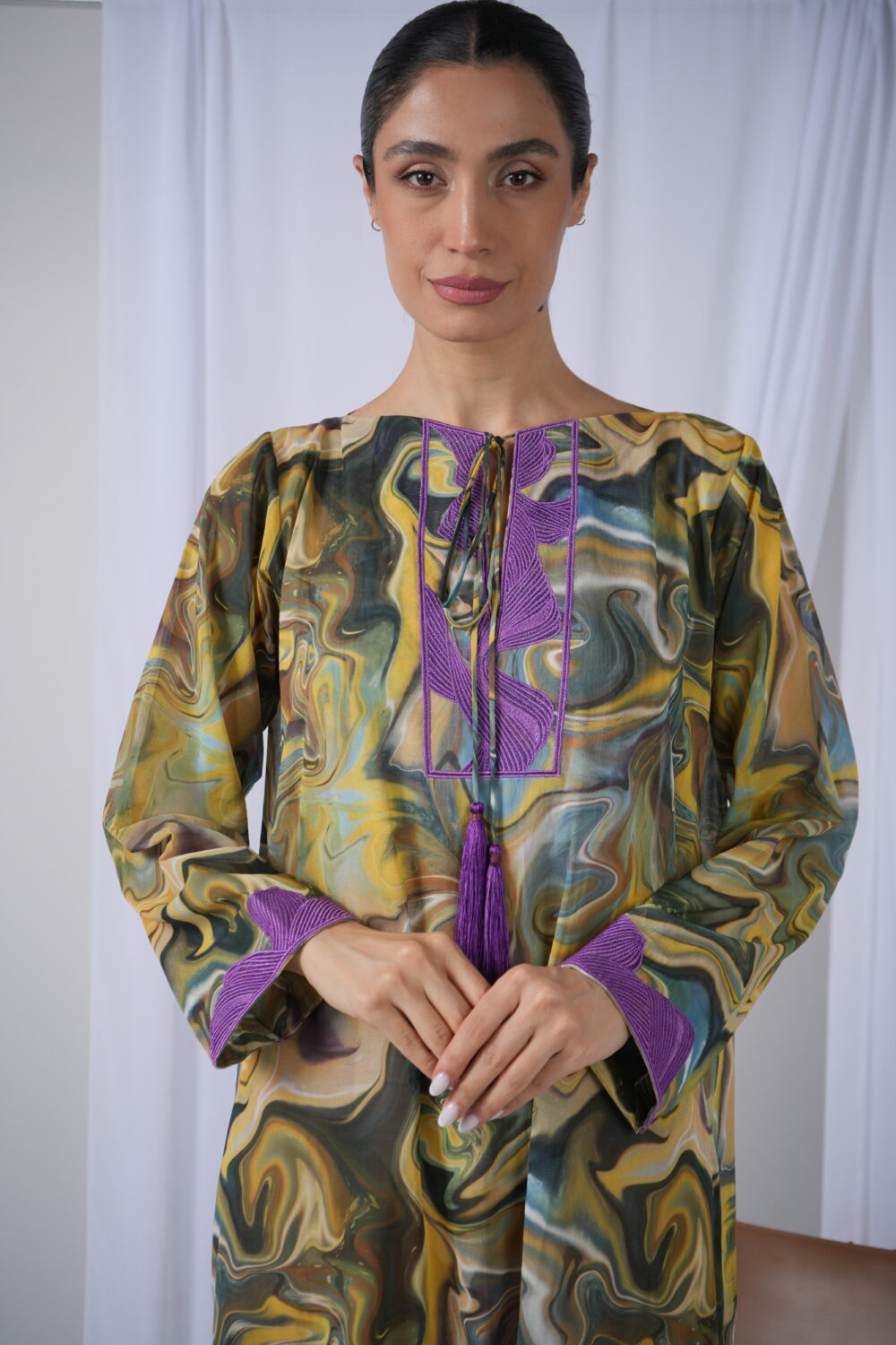 The Wavy kaftan offers versatile styling with its unique reversible design. Crafted from 100% cotton, this straight-cut kaftan features a long cord with fringe tassels for closure. The neckline, both inside and out, is adorned with hand-embroidered wave patterns in a captivating purple hue. Untie the caftan to reveal the fully patterned interior, adding another dimension to this elegant piece. Wear it open or closed to suit your style.